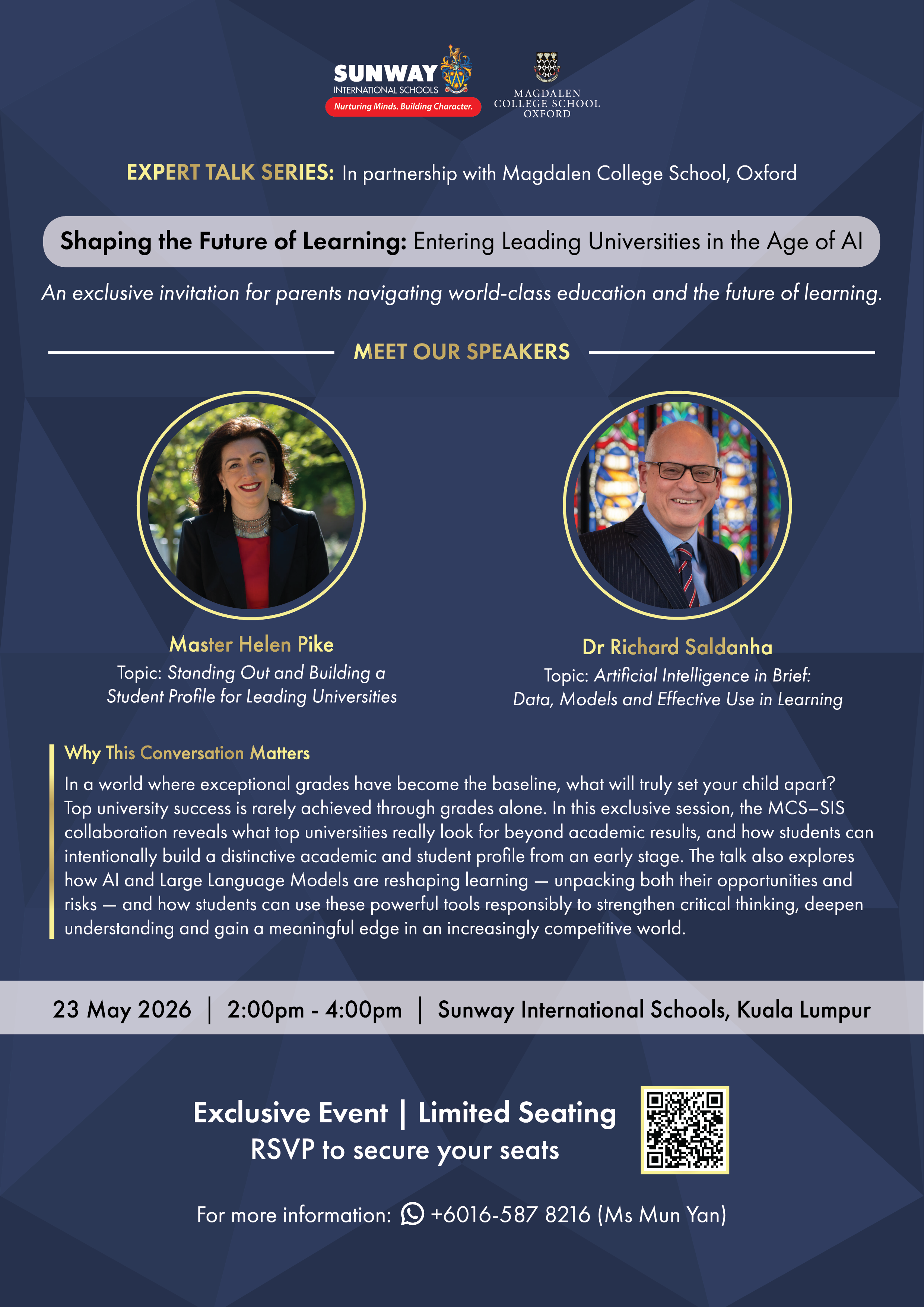 Elite university outcomes are rarely the result of isolated interventions. The MCS–SIS collaboration brings together school leadership insight and a practical understanding of how the AI era is reshaping thinking, learning assessment and student profile building — ensuring students develop the depth, distinction and capabilities that elite institutions continue to prioritise.